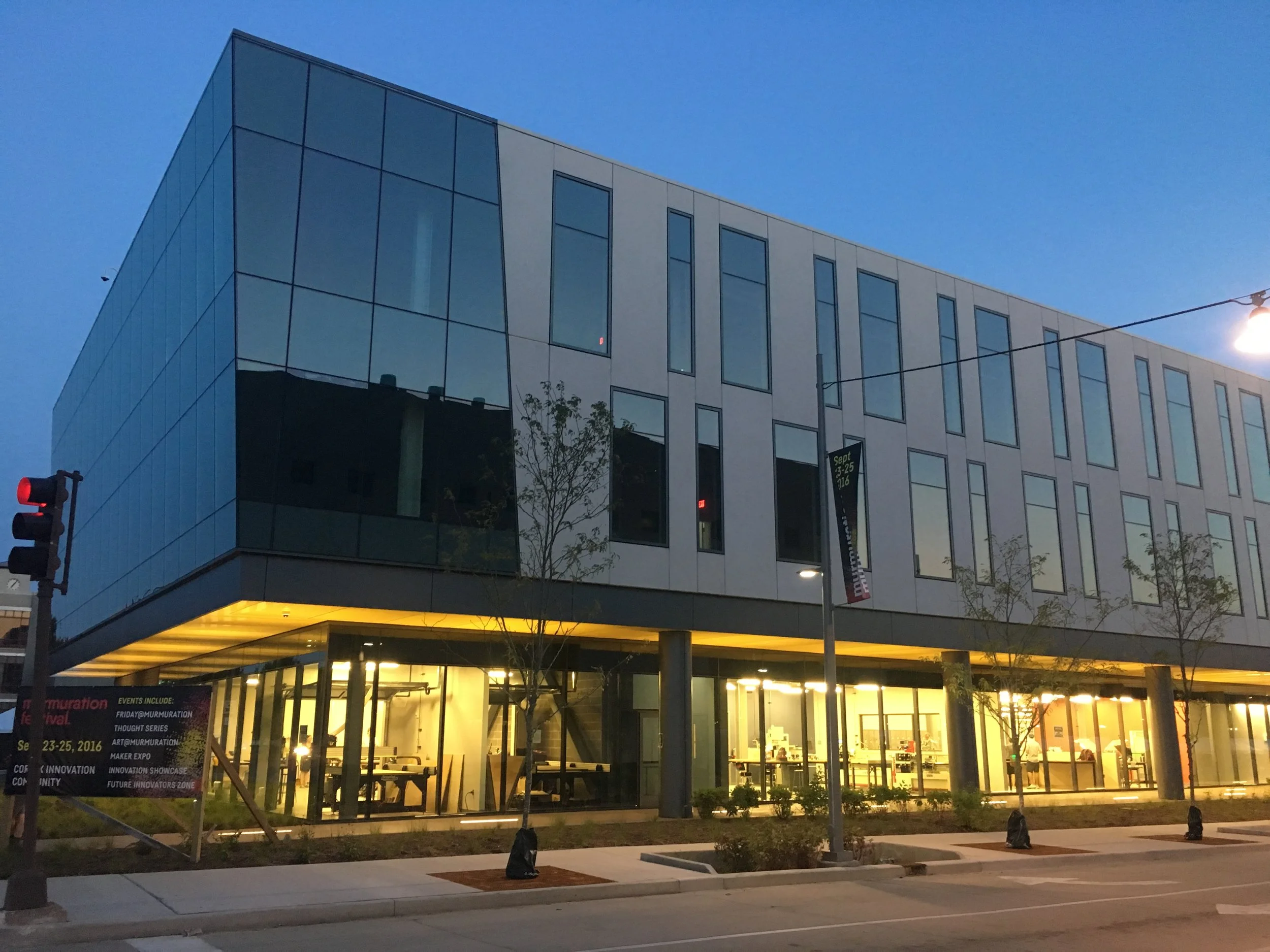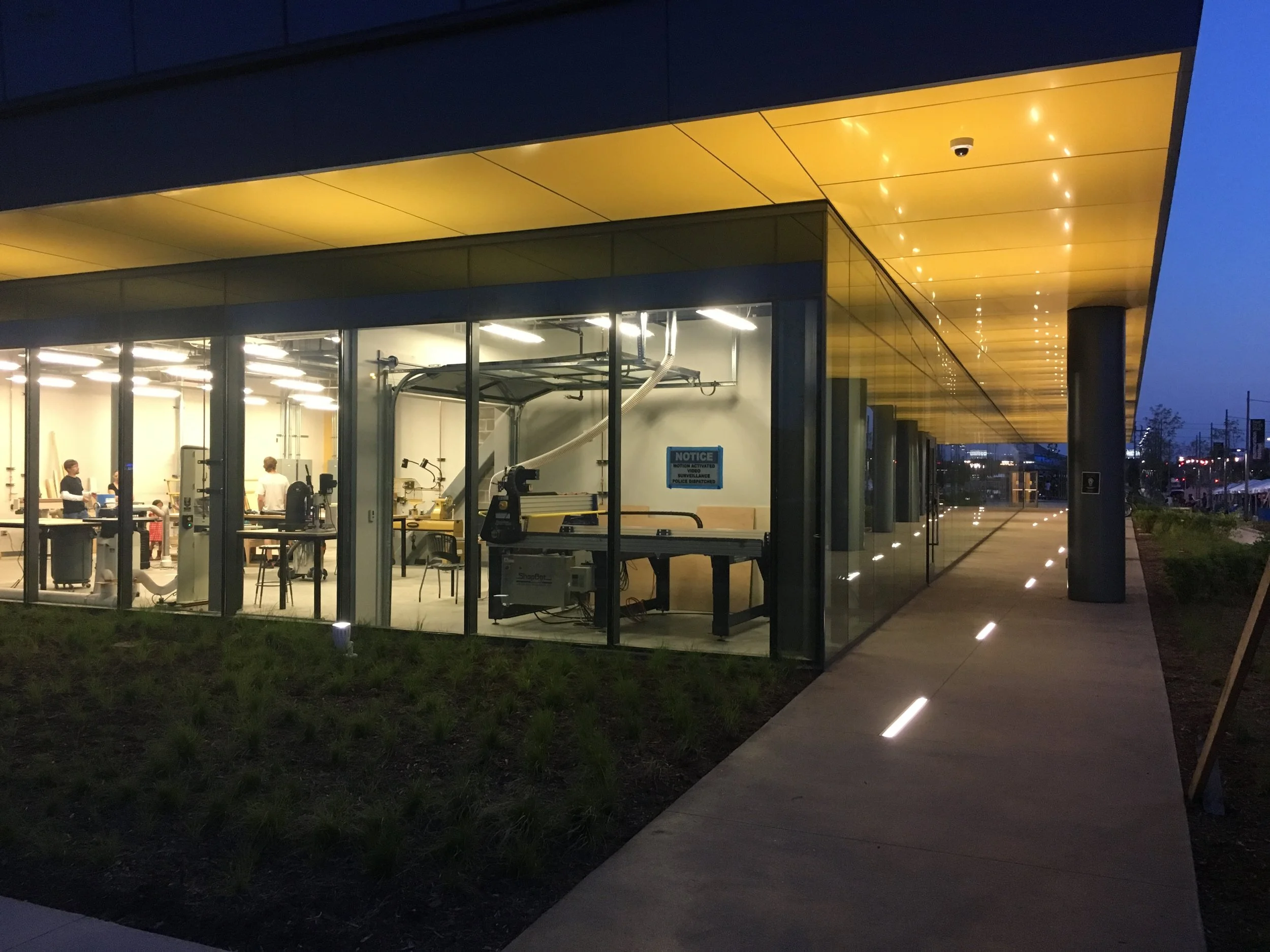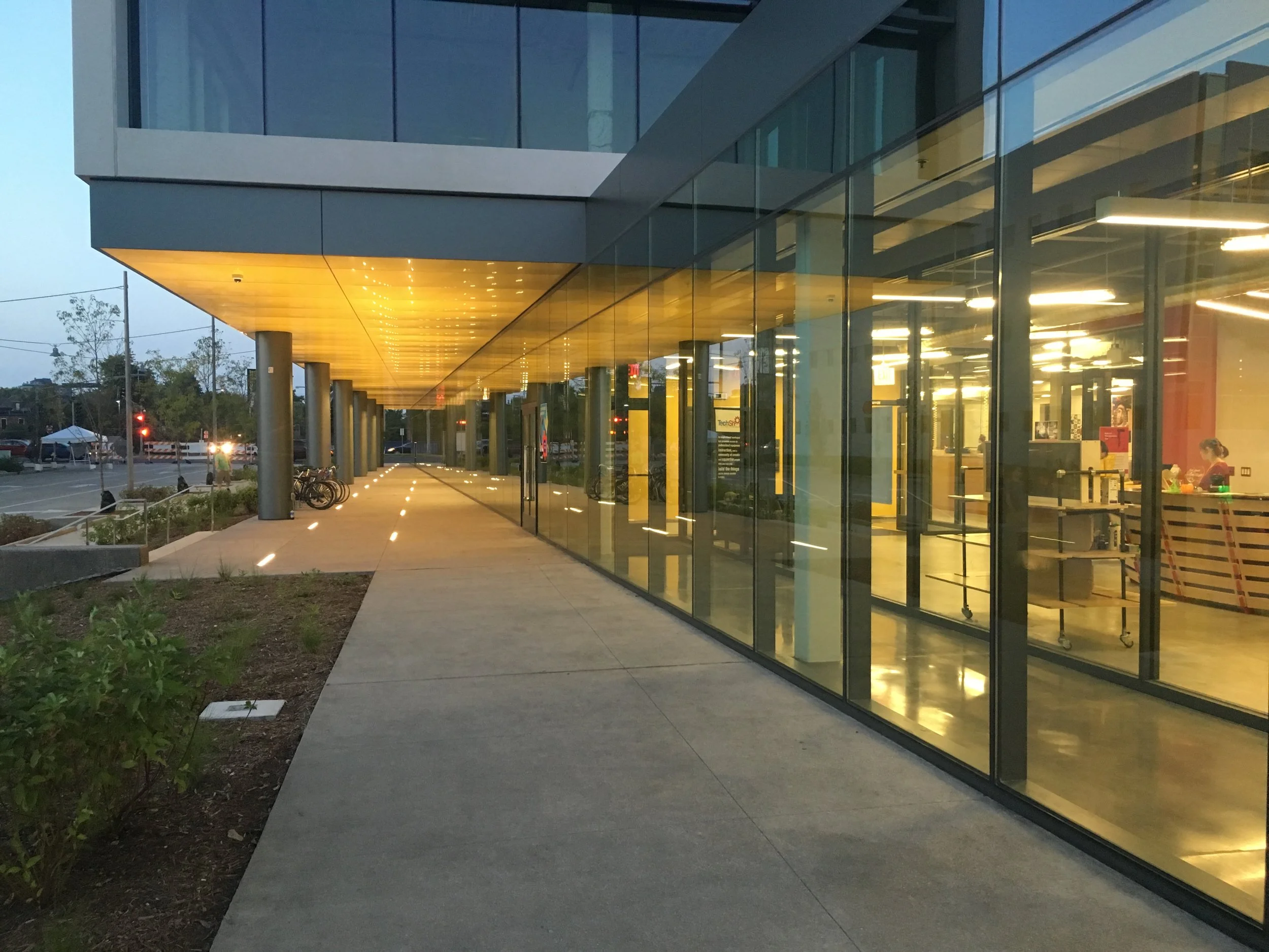 Finishing touches...@ 4260 Cortex the inground LED's that uplight the yellow metal panel soffit were installed just in time for the Murmuration Festival!
